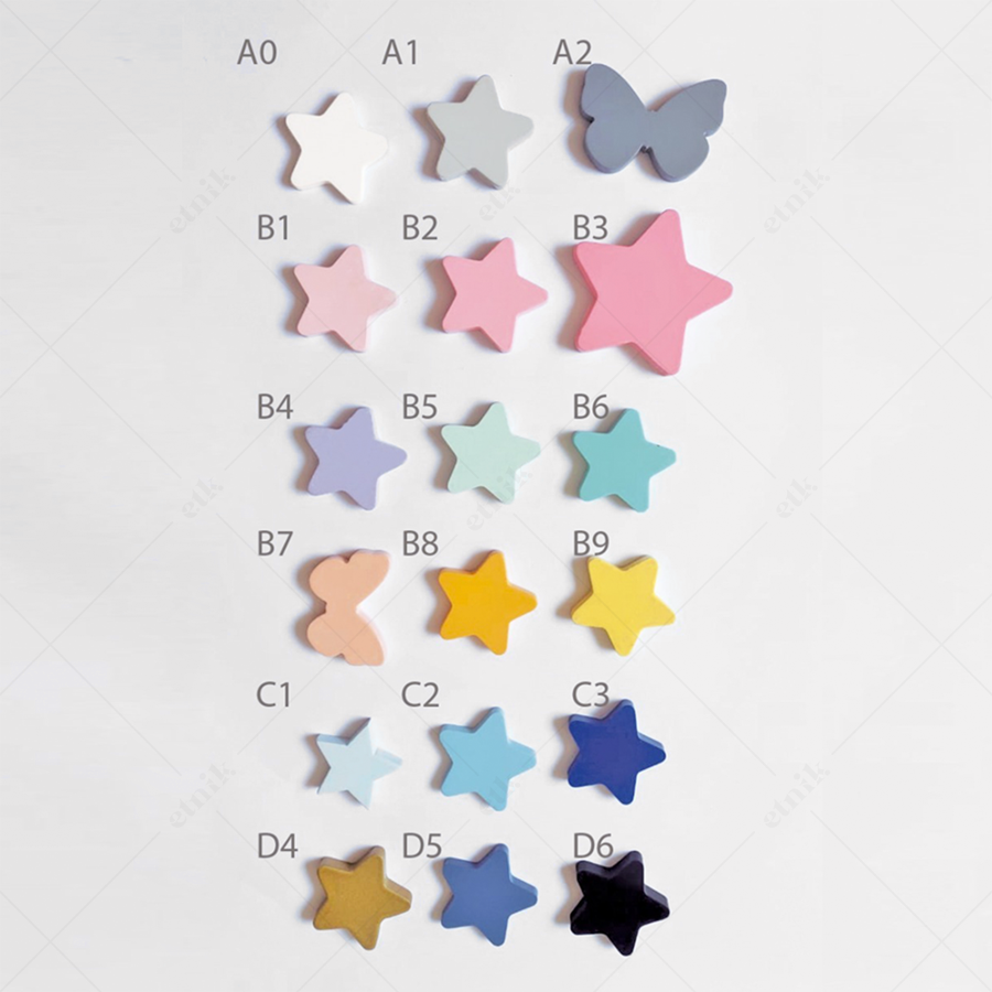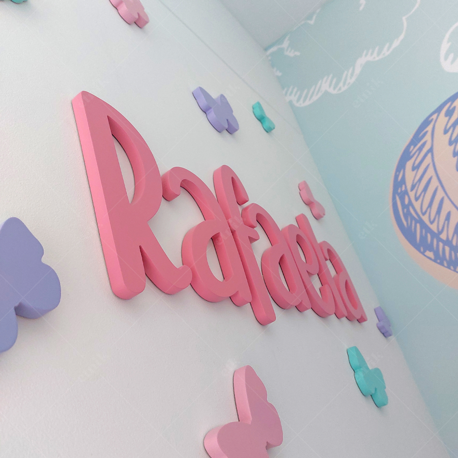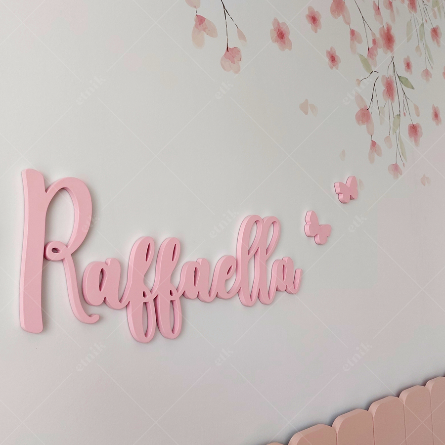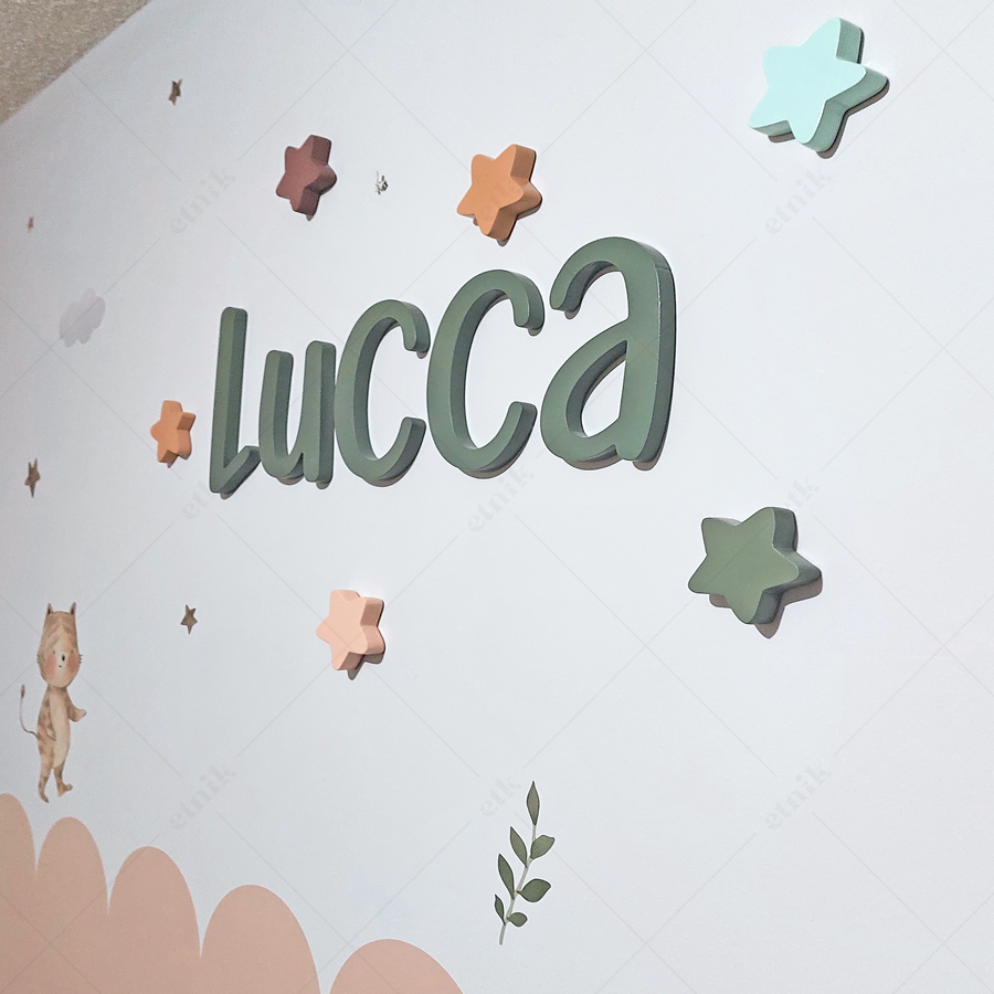 Nuestros lettering (nombres de madera) son trabajados en MDF y madera con acabado gloss mate en color a elección. Cada nombre viene con 3 piezas deco de regalo, puedes elegir entre estrellas, mariposas o corazones.